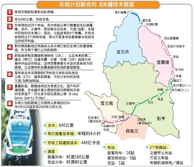 马东铁全长665多公里,被视为连通马来西亚东西海岸的“陆上桥梁”, 该工程2017年8月动工,但2018年7月马来西亚大选“变天”后被叫停。经过两边从头评估媾和判,2019年4月签署缩减技俩范围的补充合同。